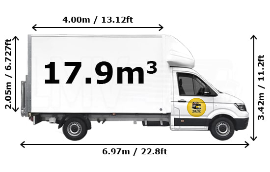 The Luton Van, equipped with a tail lift and boasting a loading space of 17 cubic meters, is perfectly designed for transporting larger household goods. It can accommodate the contents of a 2-3 bedroom house. This includes furniture such as sofas, king-size beds, and wardrobes; appliances like washing machines and tall fridge-freezers; boxes, with a capacity to hold around 60-70 standard moving boxes; or luggage, fitting approximately 45-50 large suitcases.